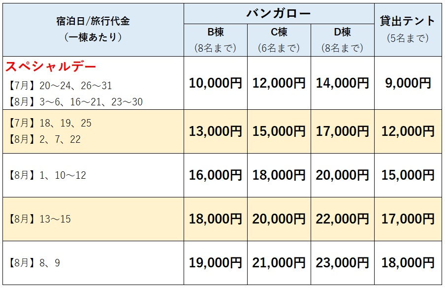 ※個人的諸費用は含まれません。キャンプ場までの交通機関はお客様ご自身の手配・負担になります。
