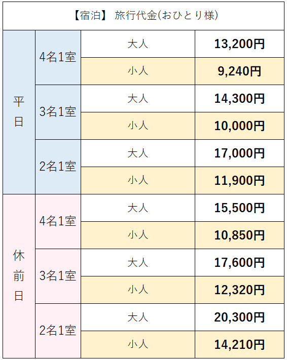※添い寝乳幼児(未就学児まで):食事なし、寝具なしの場合、2,100円。