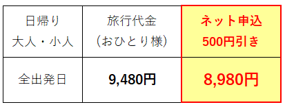 ※お日にちの近い出発日は、お申込み画面に表示されません。お電話にてお問い合わせ下さい。
