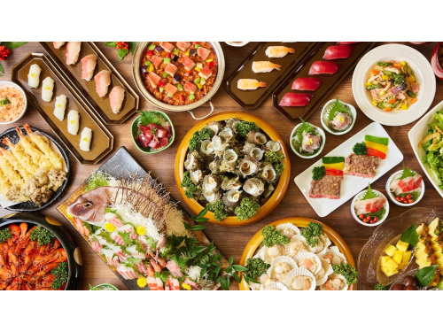 夕食は新鮮な刺身やサザエのつぼ焼き、お寿司、天ぷらなど旬の素材を活かした約60品のバイキング!