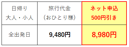 ※お日にちの近い出発日は、お申込み画面に表示されません。お電話にてお問い合わせ下さい。