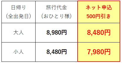 ※お日にちの近い出発日は、お申込み画面に表示されません。お電話にてお問い合わせ下さい。
