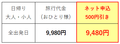 ※お日にちの近い出発日は、お申込み画面に表示されません。お電話にてお問い合わせ下さい。