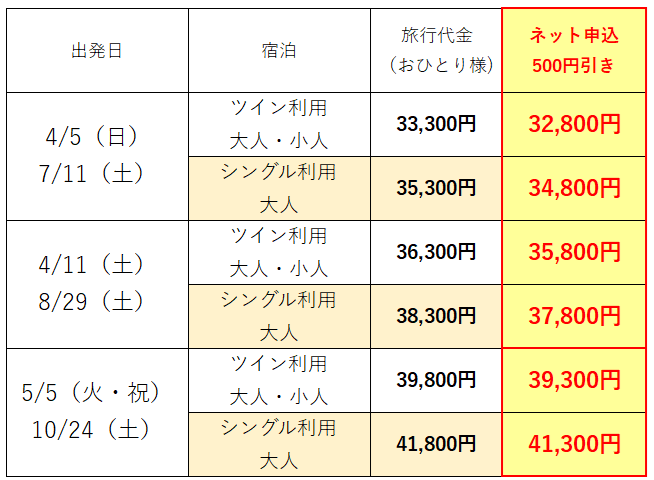 ※お日にちの近い出発日は、お申込み画面に表示されません。お電話にてお問い合わせ下さい。